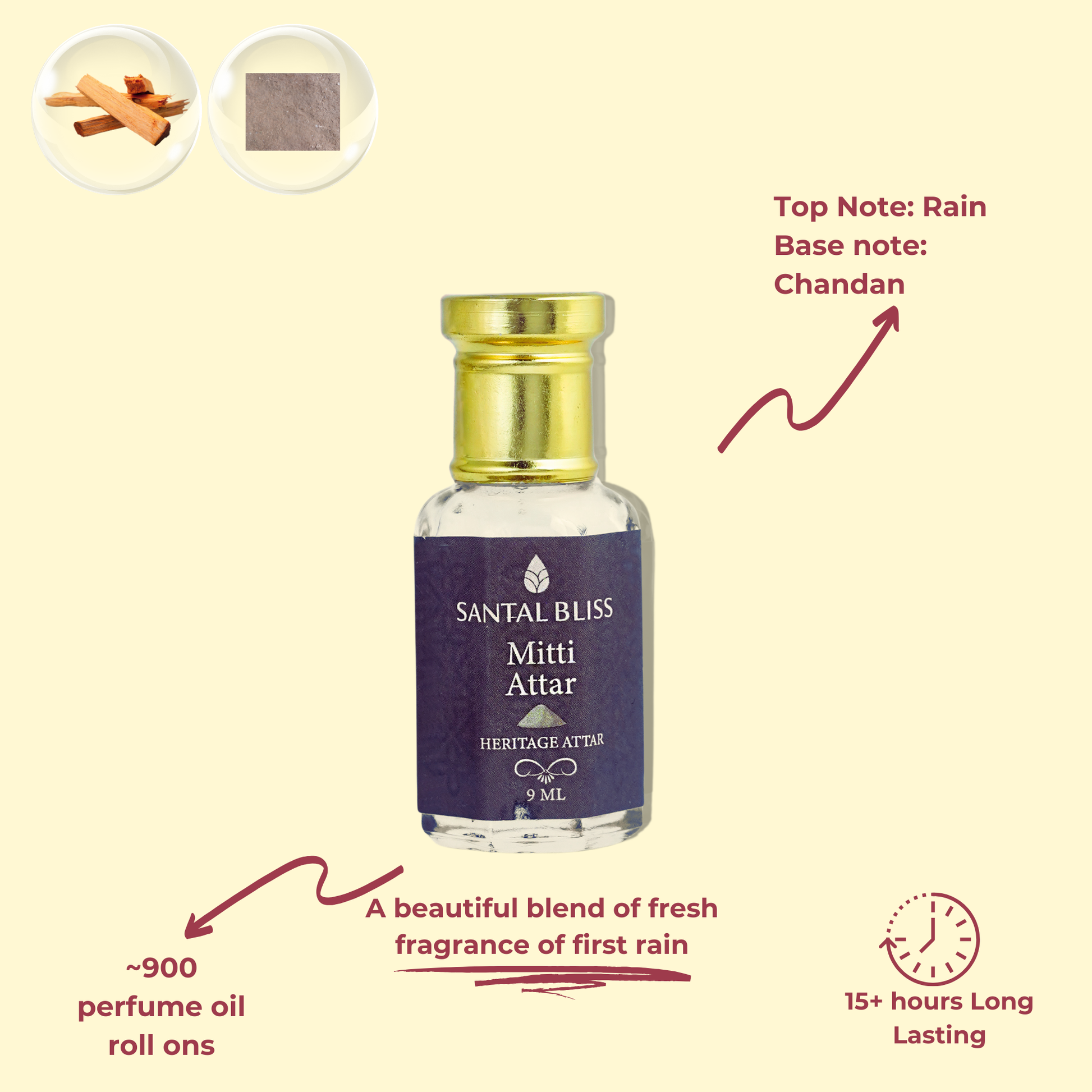 Our attar is carefully distilled with a Sandalwood base, which enriches the natural petrichor fragrance while gently nurturing your skin and spirit. When applied, it harmonizes with your body’s chemistry, creating a warm, calming scent that lingers softly and offers subtle restorative effects.